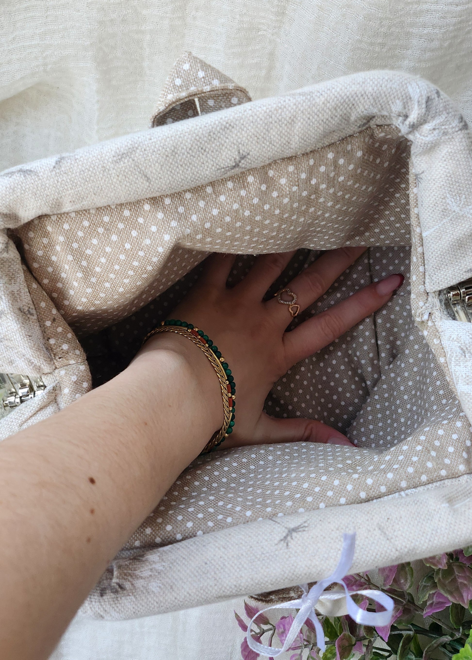 Pratico, leggero e completamente realizzato a mano in cotone, presenta una chiusura a scatto semplice e funzionale che garantisce un accesso rapido e sicuro al contenuto.