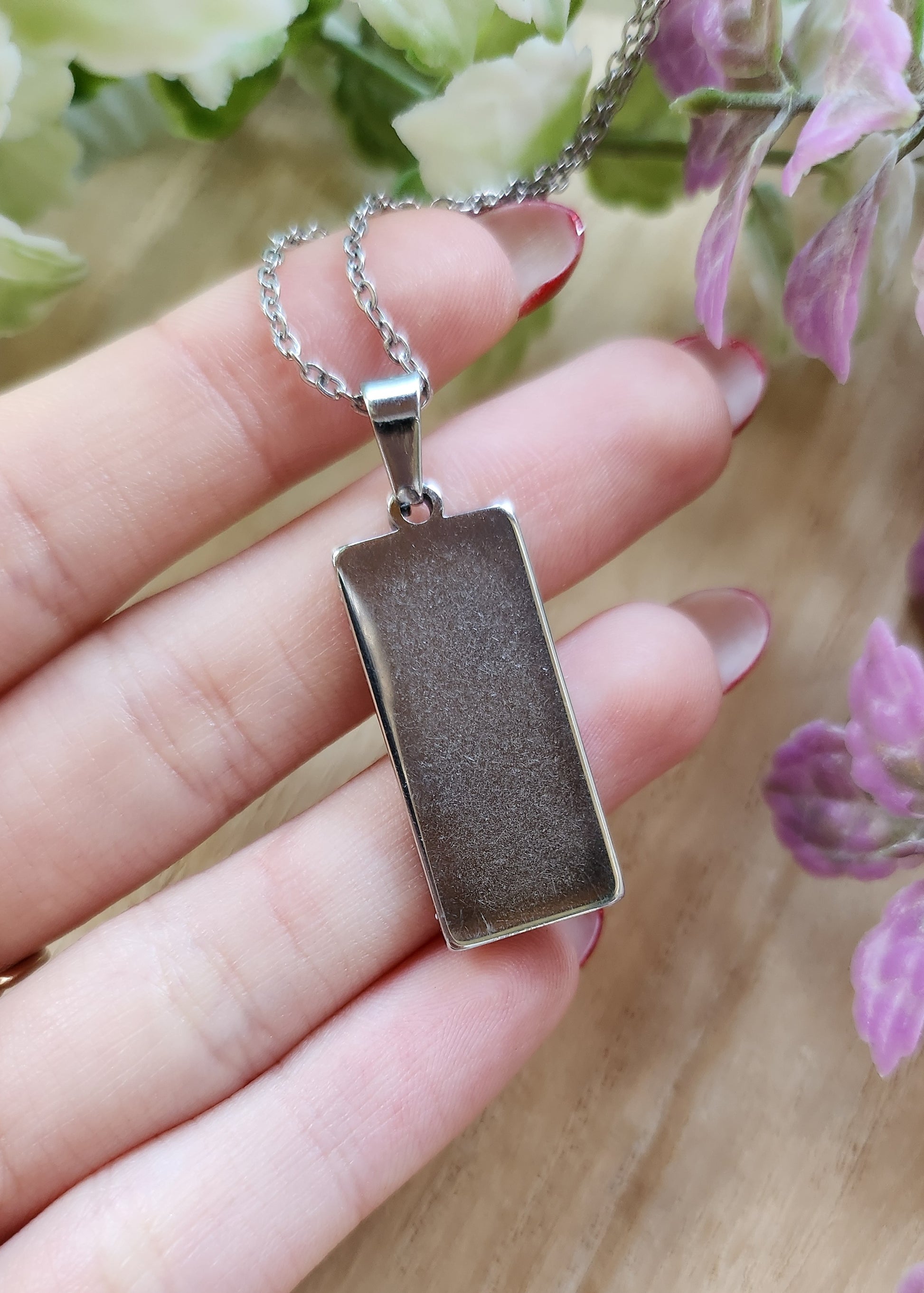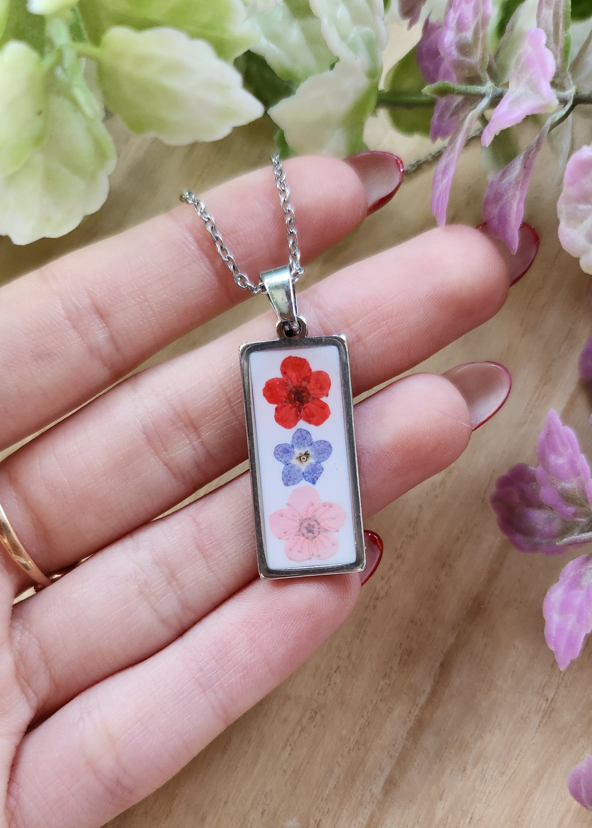 Collana in acciaio inossidabile con ciondolo decorato con tre fiorellini colorati preservati in resina epossidica.