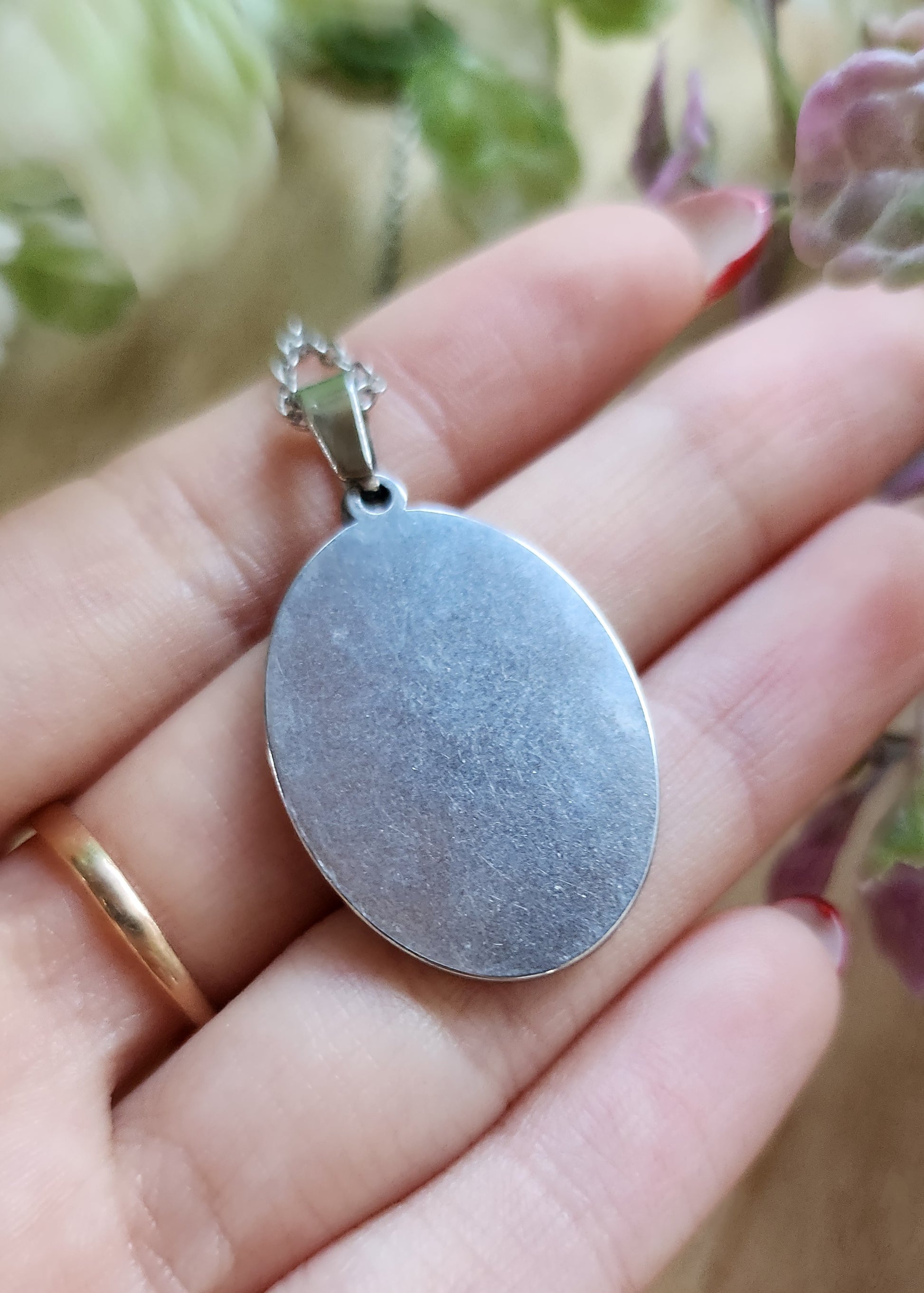 Collana in acciaio inossidabile con fiori secchi stabilizzati e racchiusi in resina epossidica, per un gioiello che conserva nel tempo la bellezza dei veri fiori. Il pendente ovale crea un elegante effetto vetrina che mette in risalto i dettagli botanici.