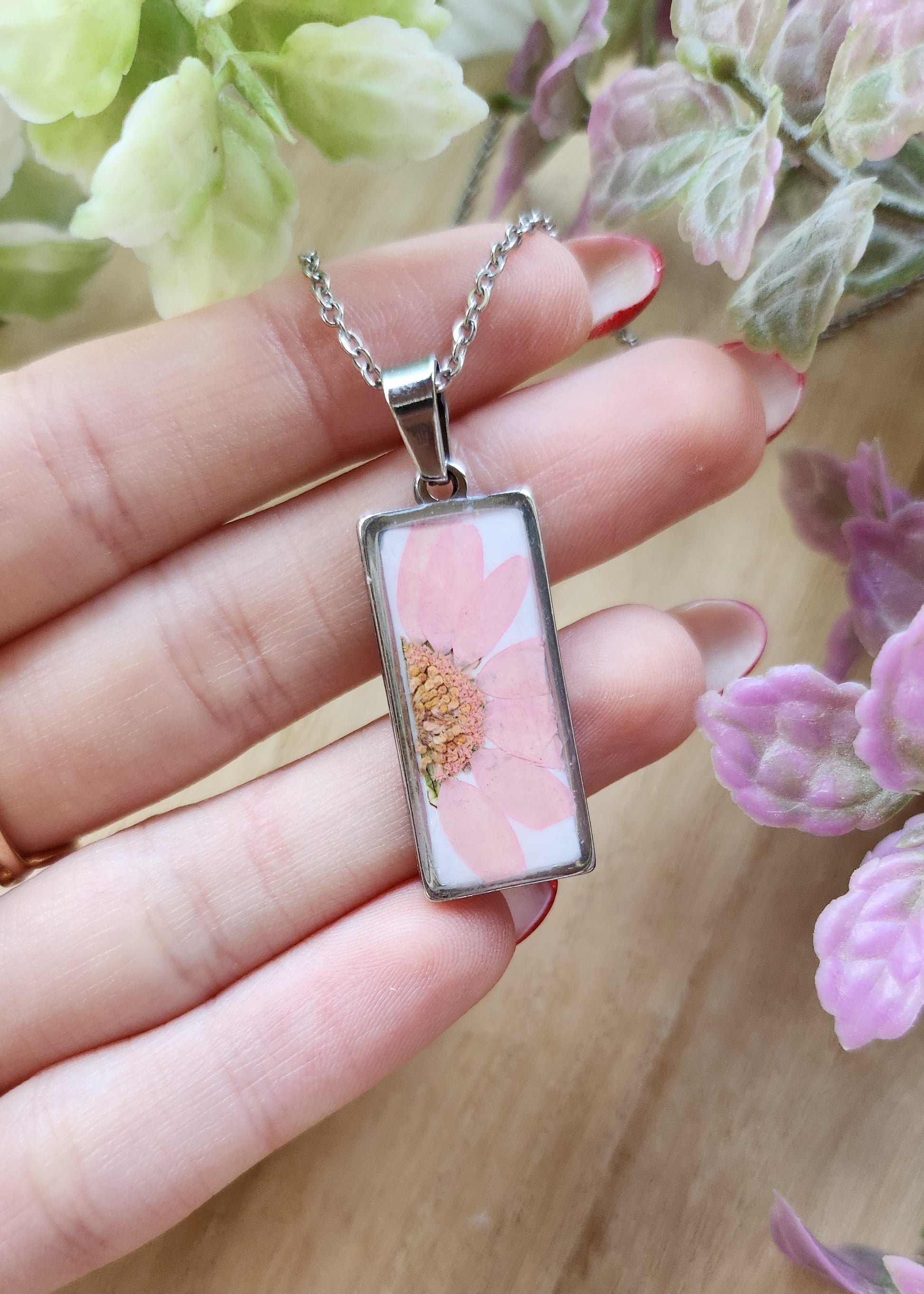 Collana in acciaio inossidabile con fiore secco stabilizzato e racchiuso in resina epossidica, per un gioiello che conserva nel tempo la bellezza dei veri fiori. Il pendente ovale crea un elegante effetto vetrina che mette in risalto i dettagli botanici.
