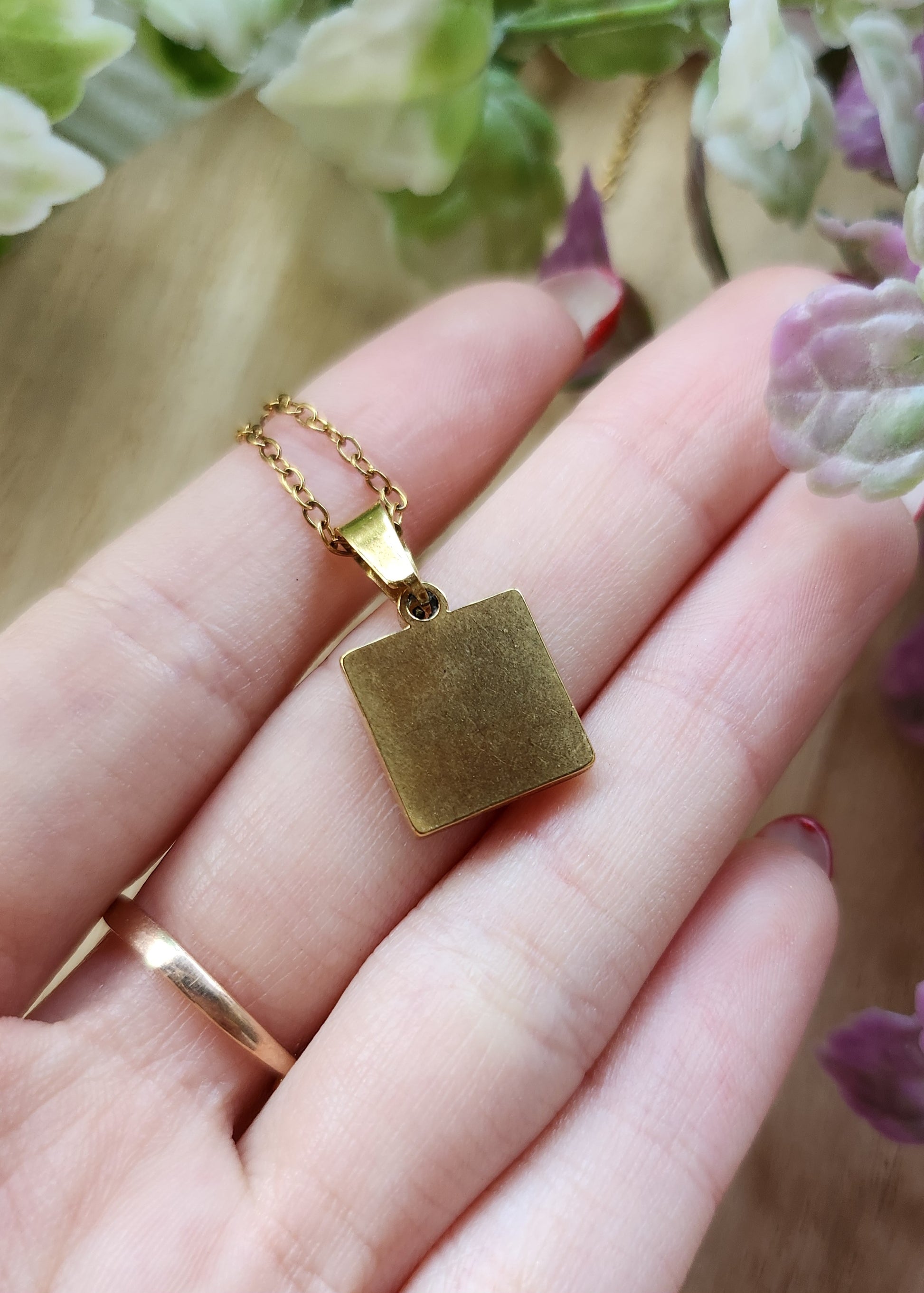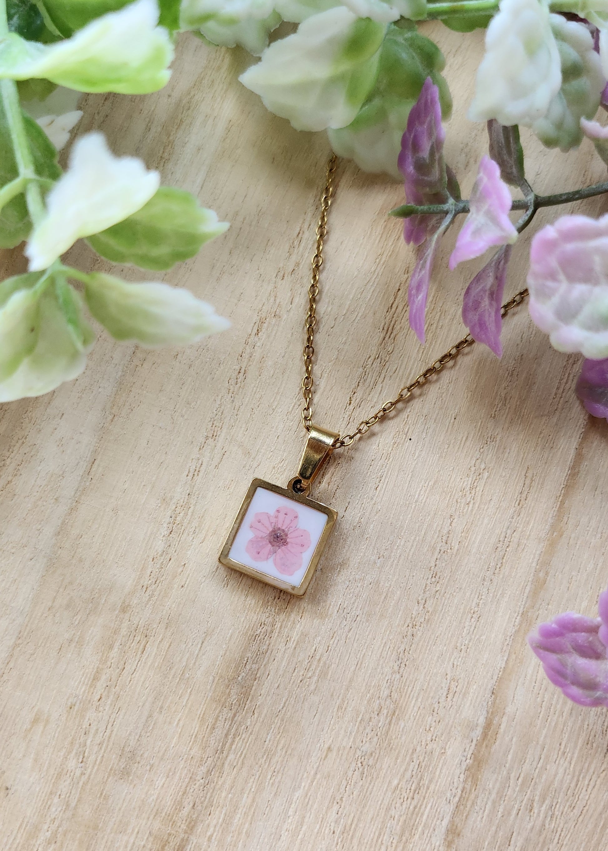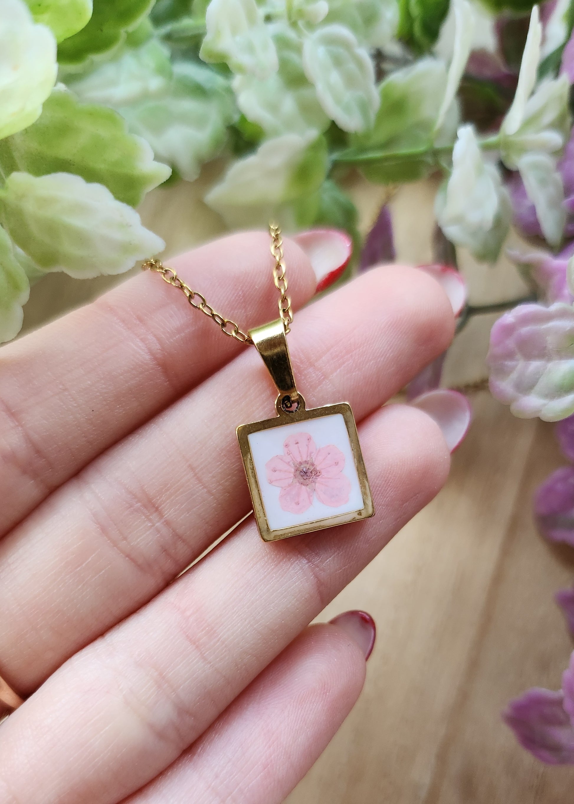 Collana in acciaio inossidabile con fiore secco stabilizzato e racchiuso in resina epossidica, per un gioiello che conserva nel tempo la bellezza dei veri fiori. Il pendente quadrato crea un elegante effetto cornice che mette in risalto i dettagli botanici.