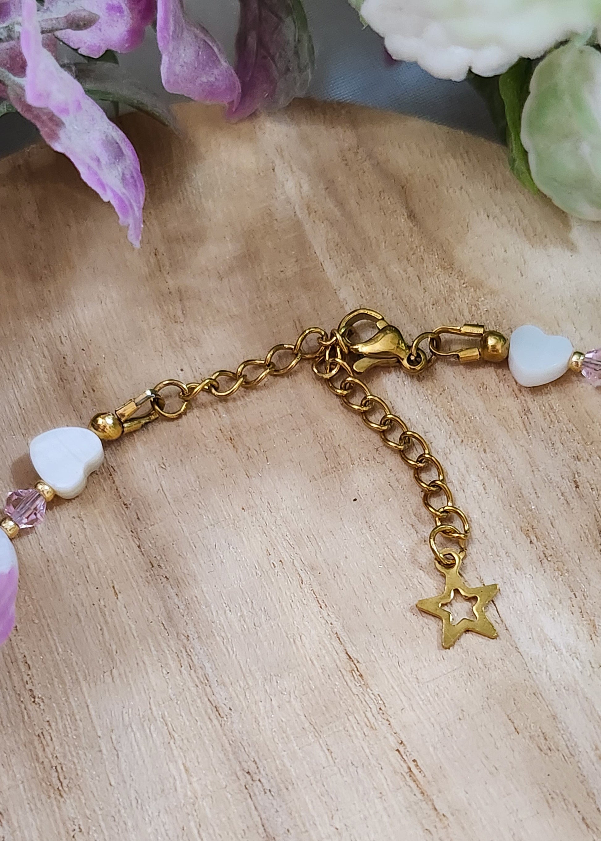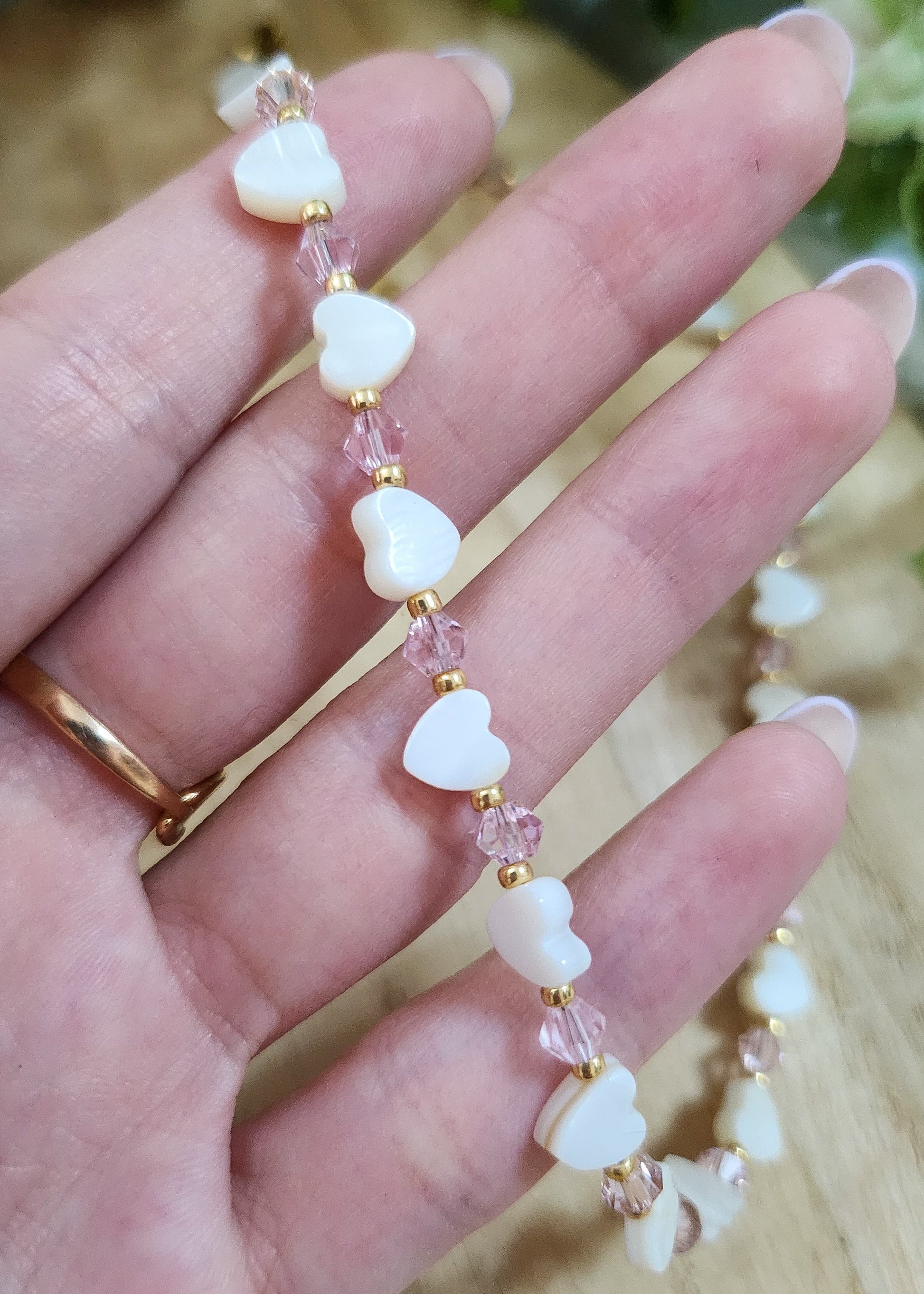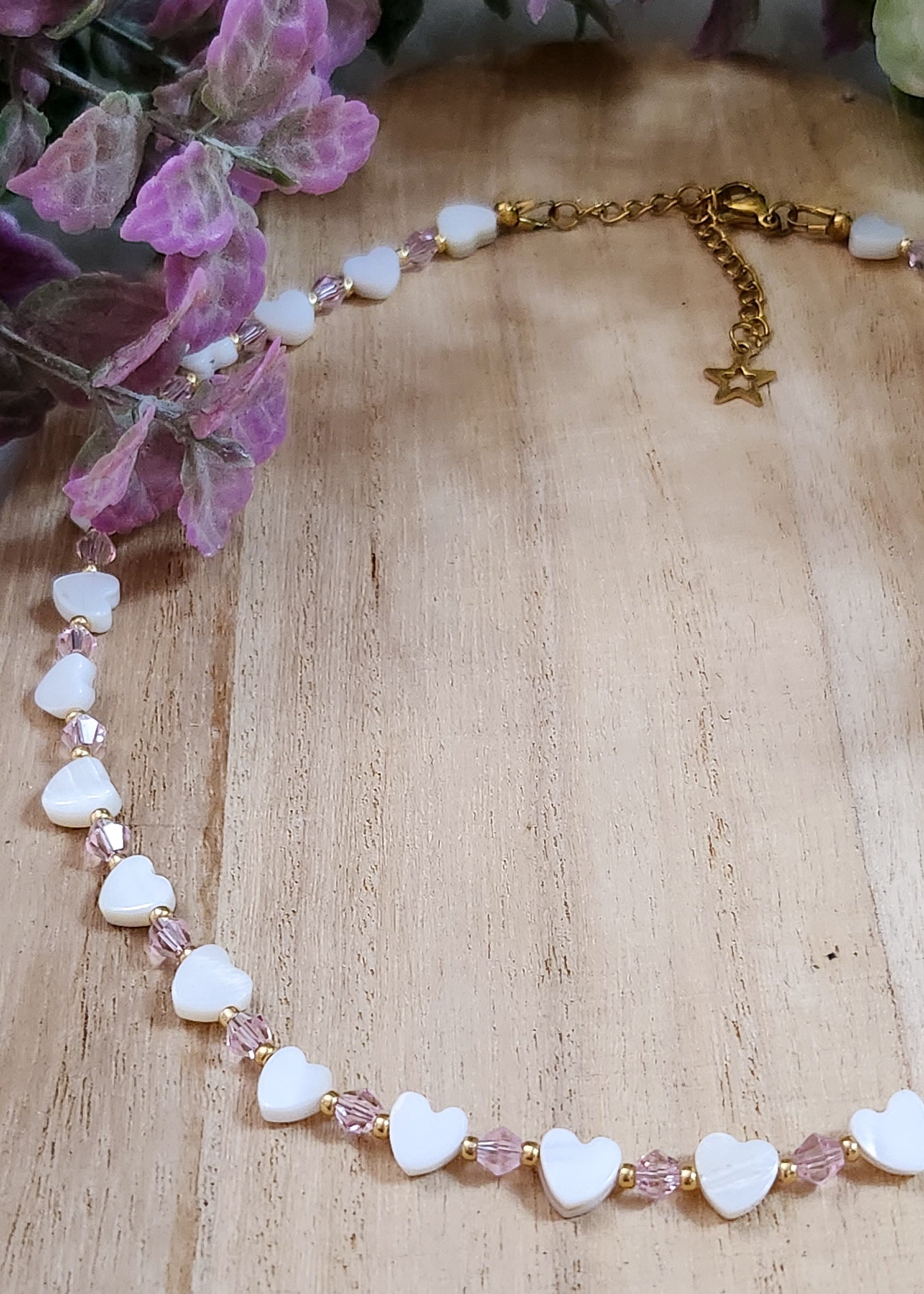 Collana girocollo realizzata a mano con cristalli swarovski rosa, cuoricini in madreperla e perline Miyuki dorate.