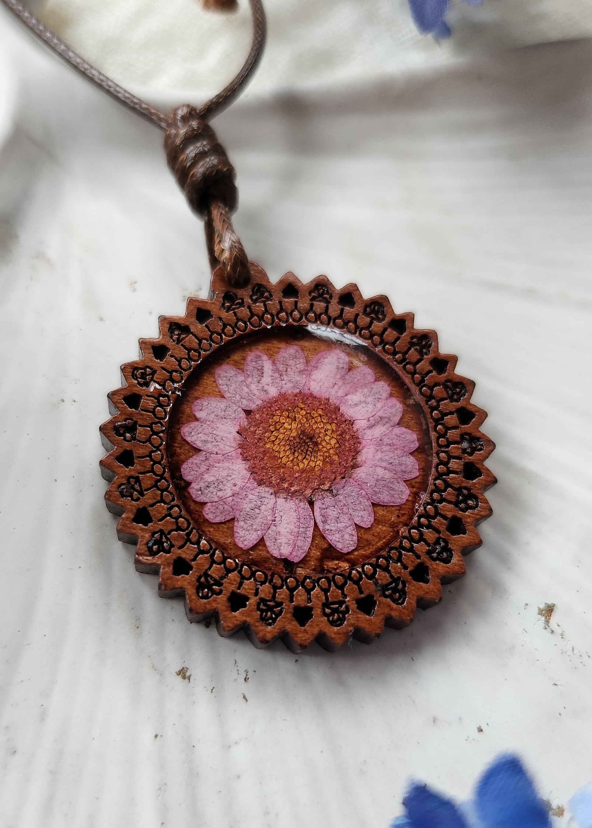 Collana artigianale con base in legno e fiore secco in resina epossidica. Ogni pezzo è unico e valorizza la bellezza autentica della natura.