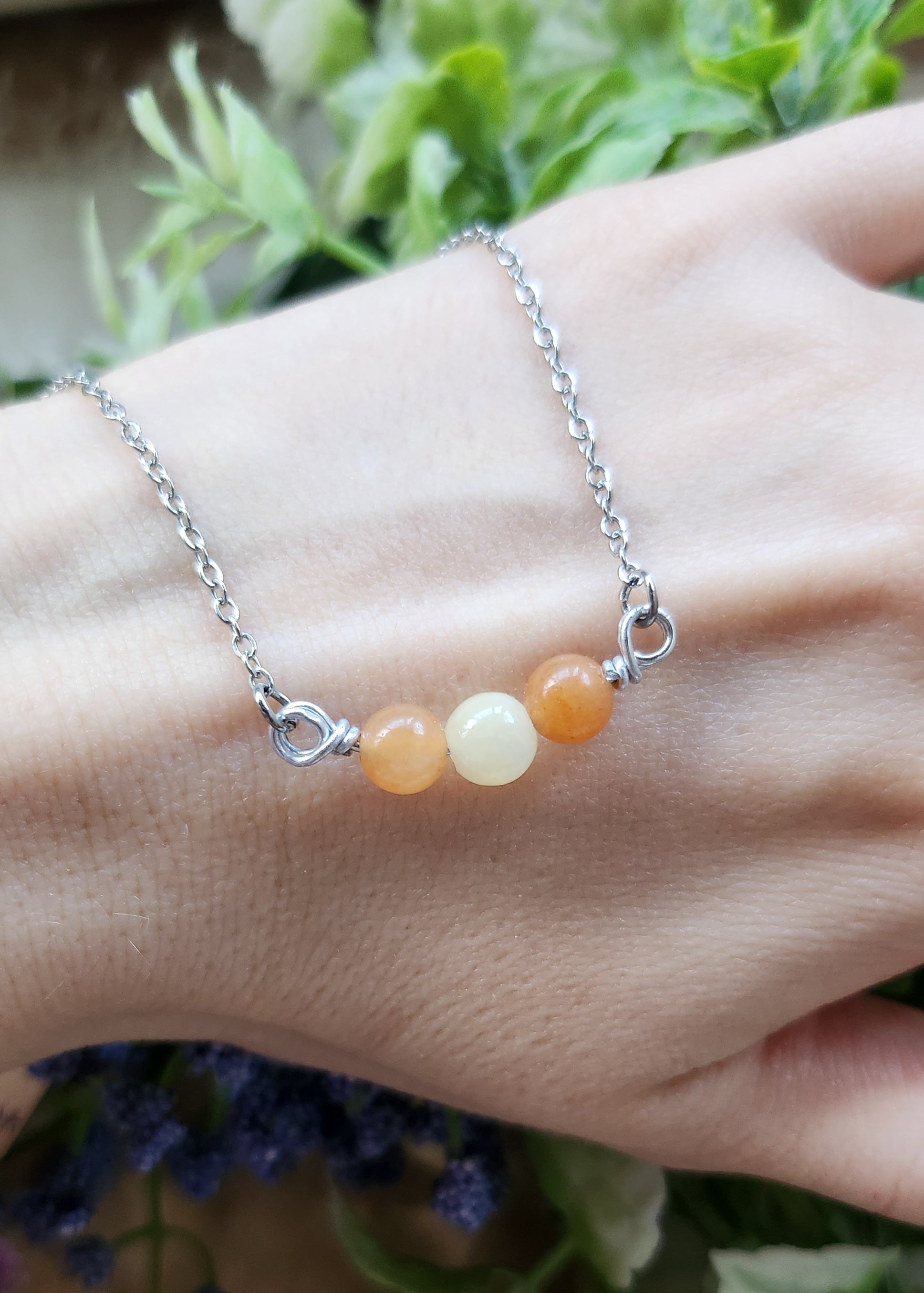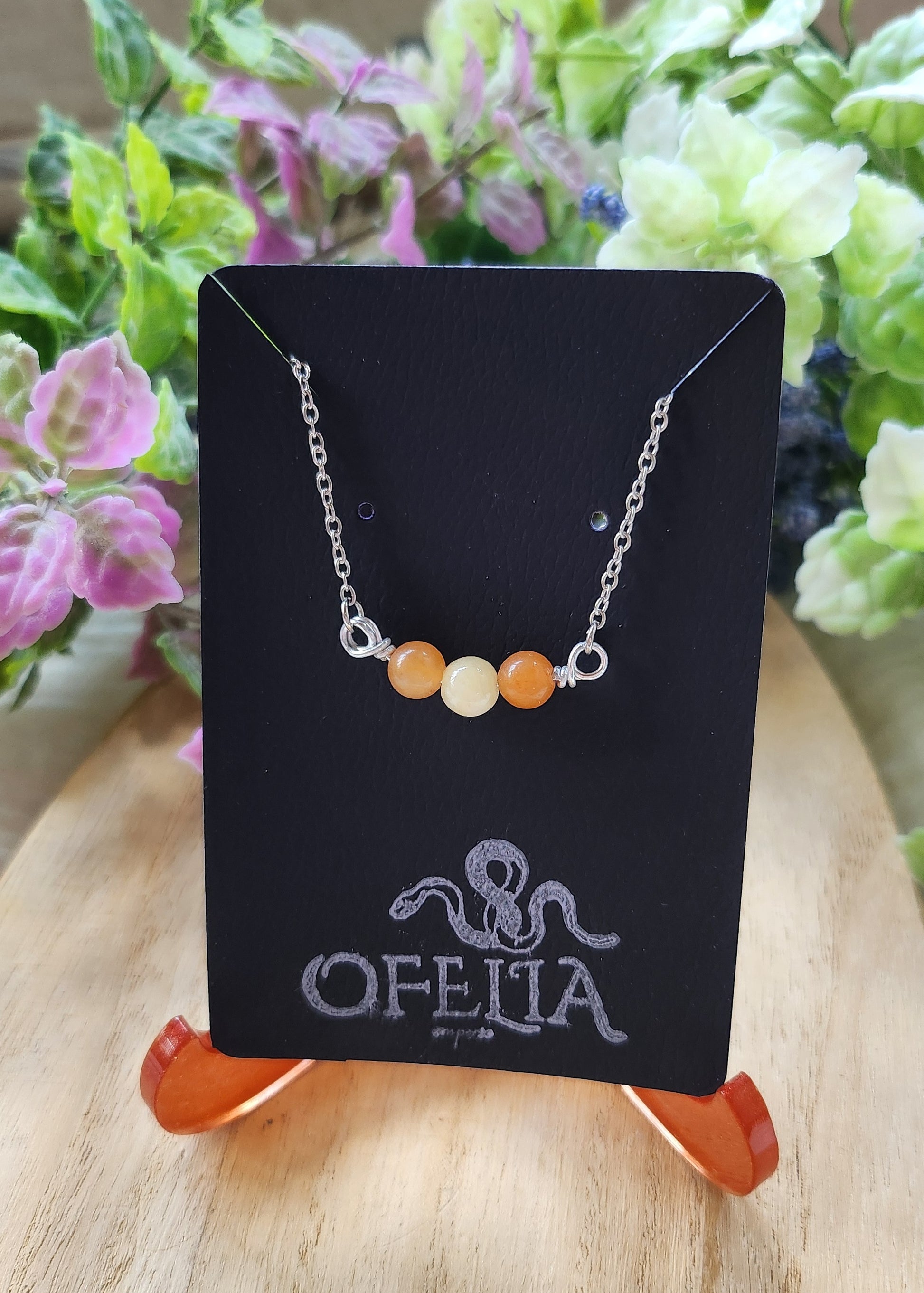 Le due sfere in avventurina arancio incorniciano la pietra centrale in giada gialla, creando un’armonia di colori e significati.