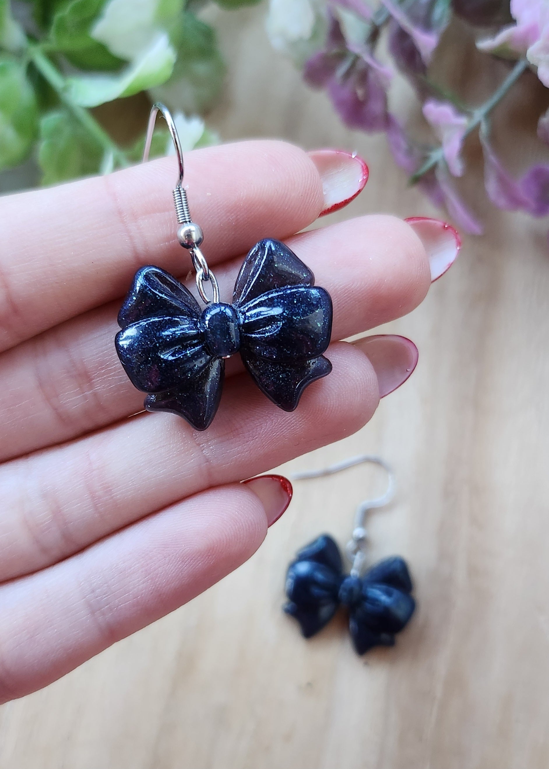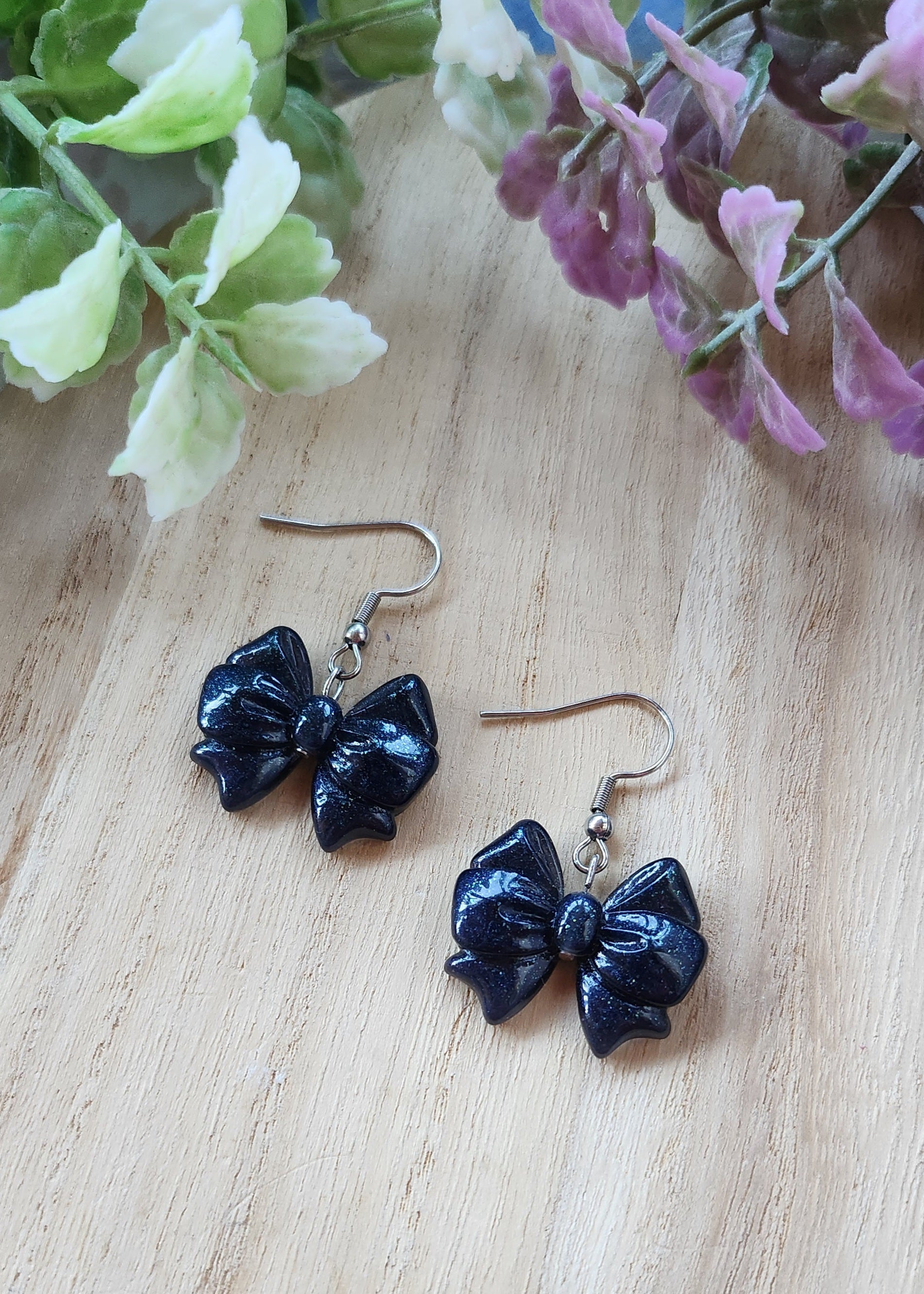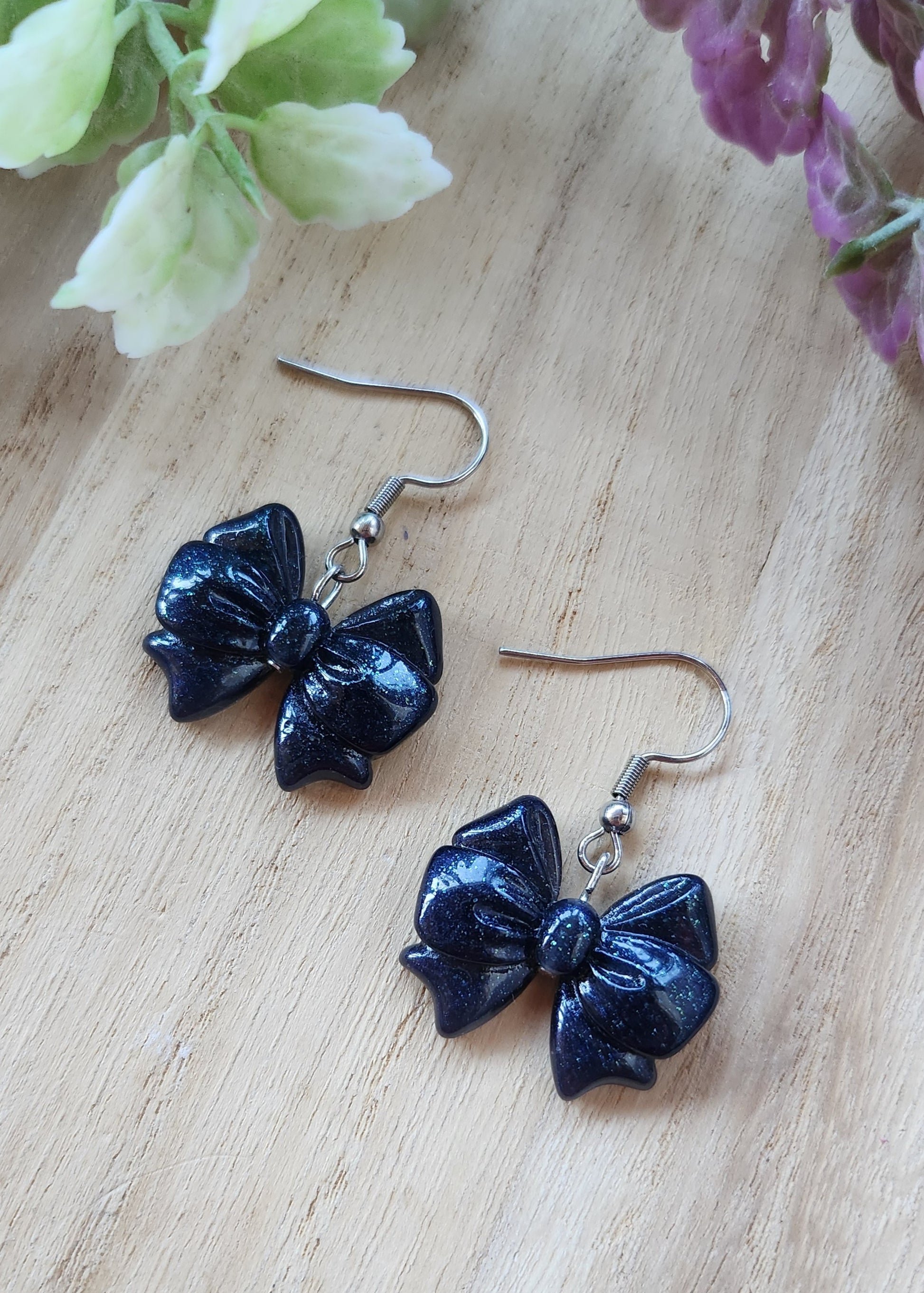 Orecchini in acciaio inossidabile con fiocchi in resina epossidica realizzati a mano.
