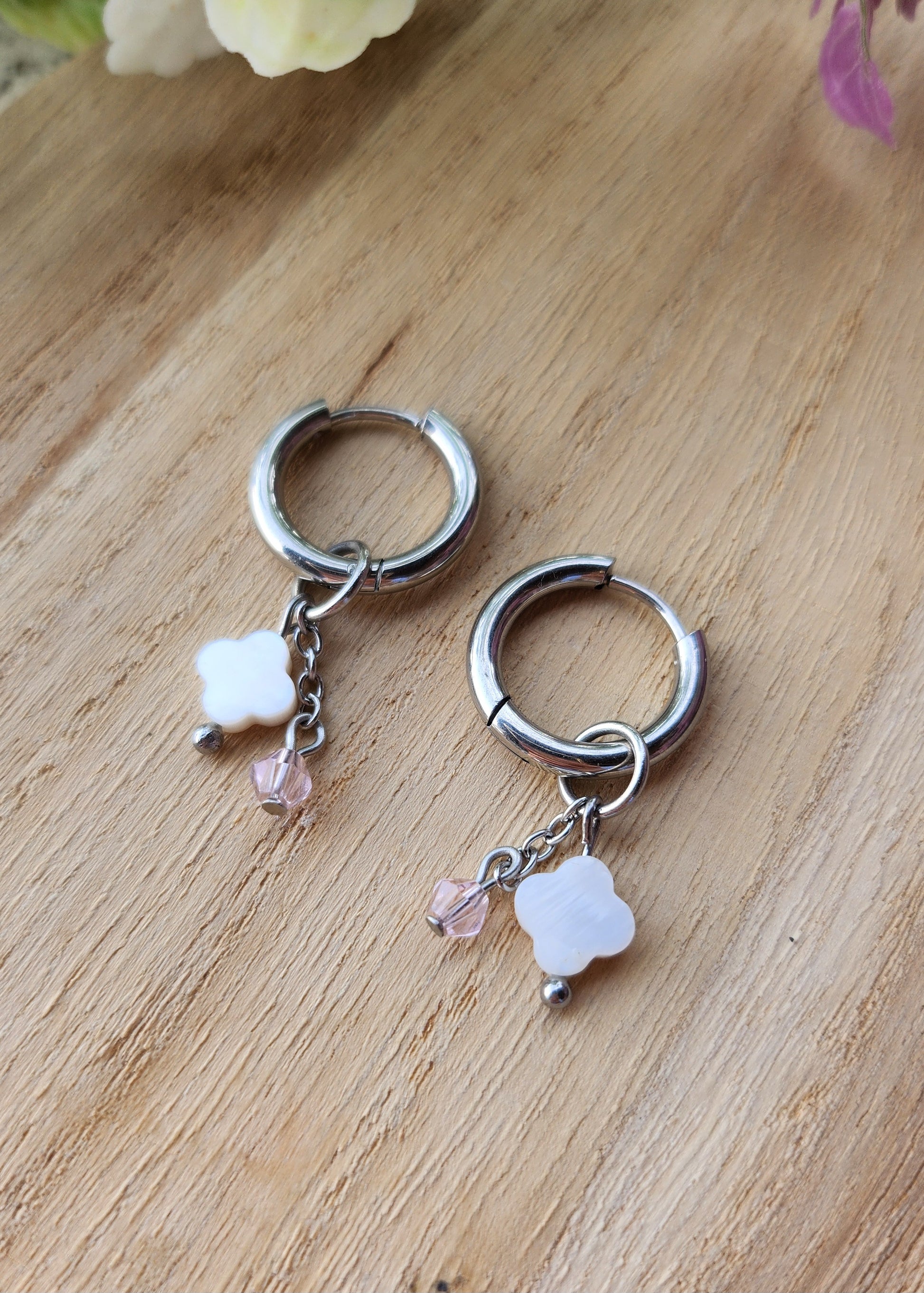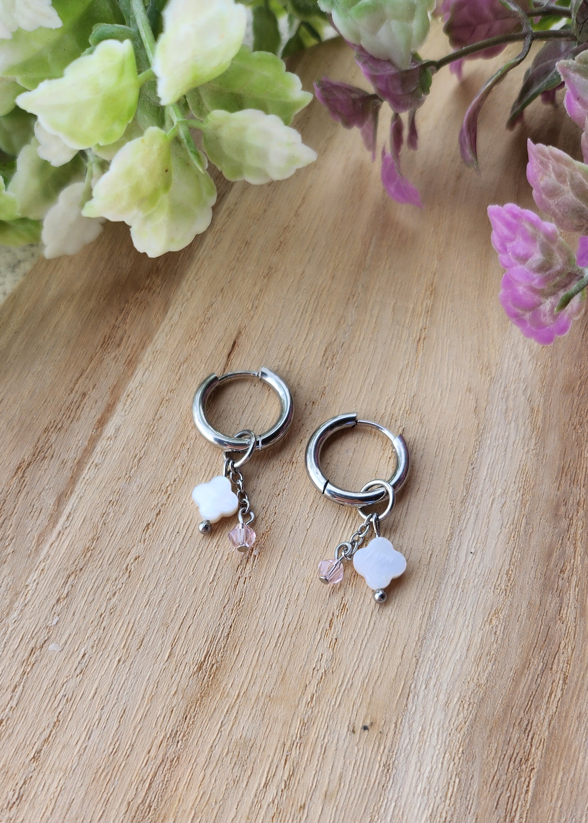 Orecchini a cerchietto in acciaio inossidabile con pendente a fiore in madreperla e cristallo rosa.