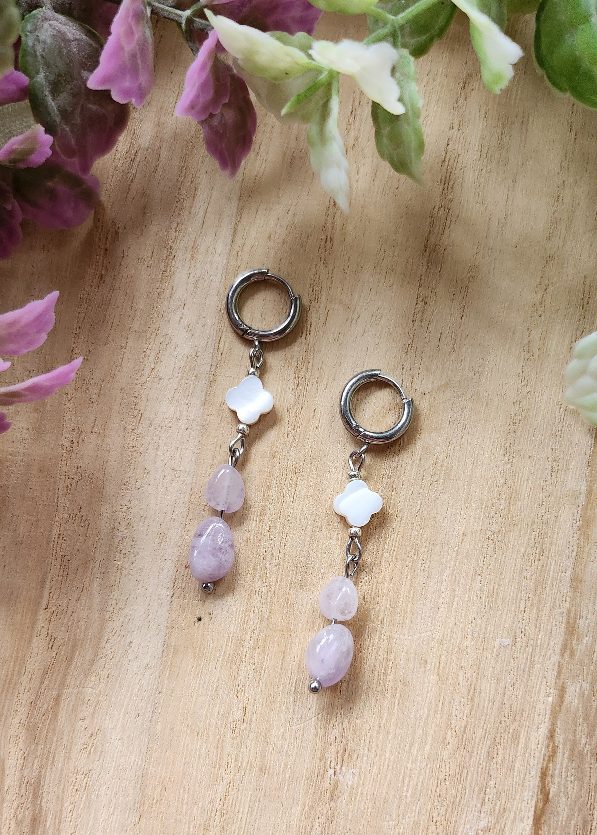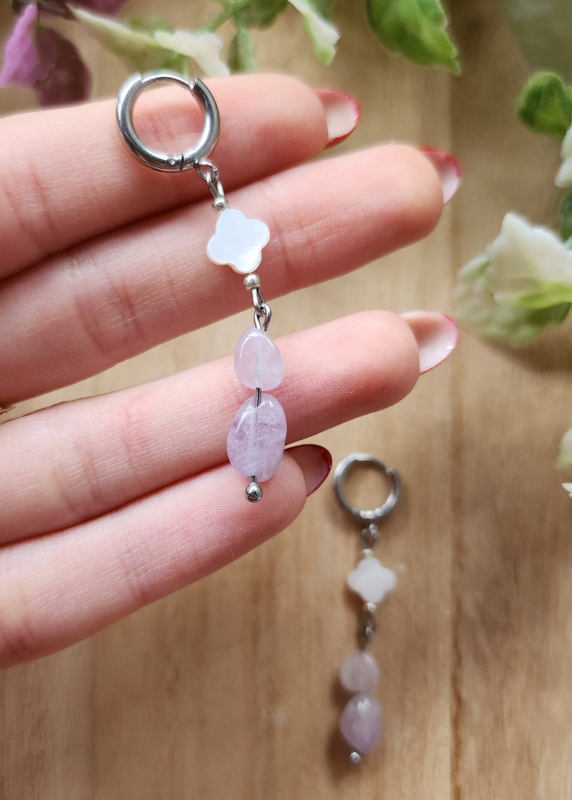 Orecchini pendenti realizzati a mano con quadrifoglio in Madreperla e pepite in ametista lavanda.
