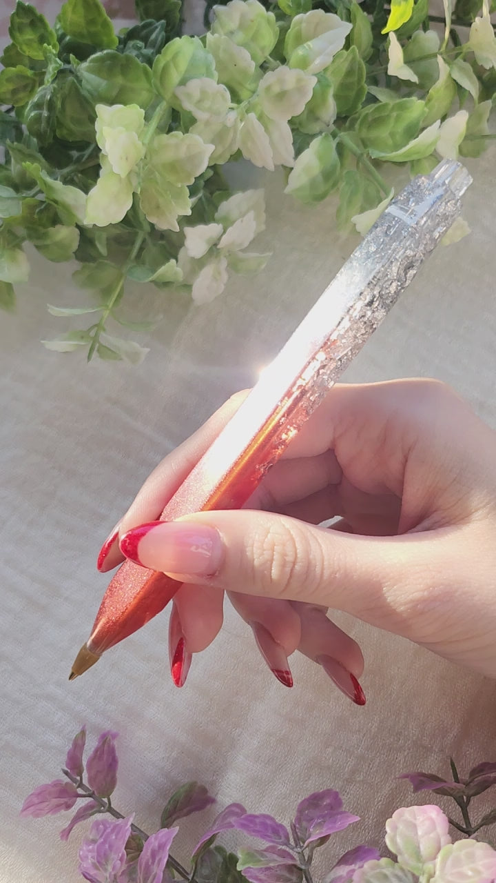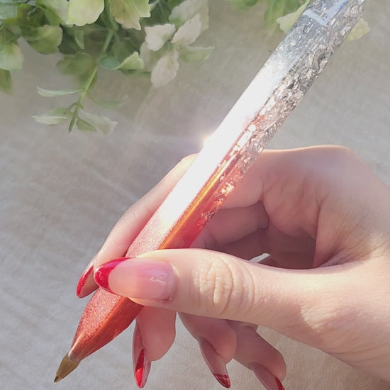La superficie lucida della resina cattura la luce e mette in risalto i giochi cromatici interni, trasformando un gesto quotidiano come scrivere in un piccolo momento di magia e bellezza.