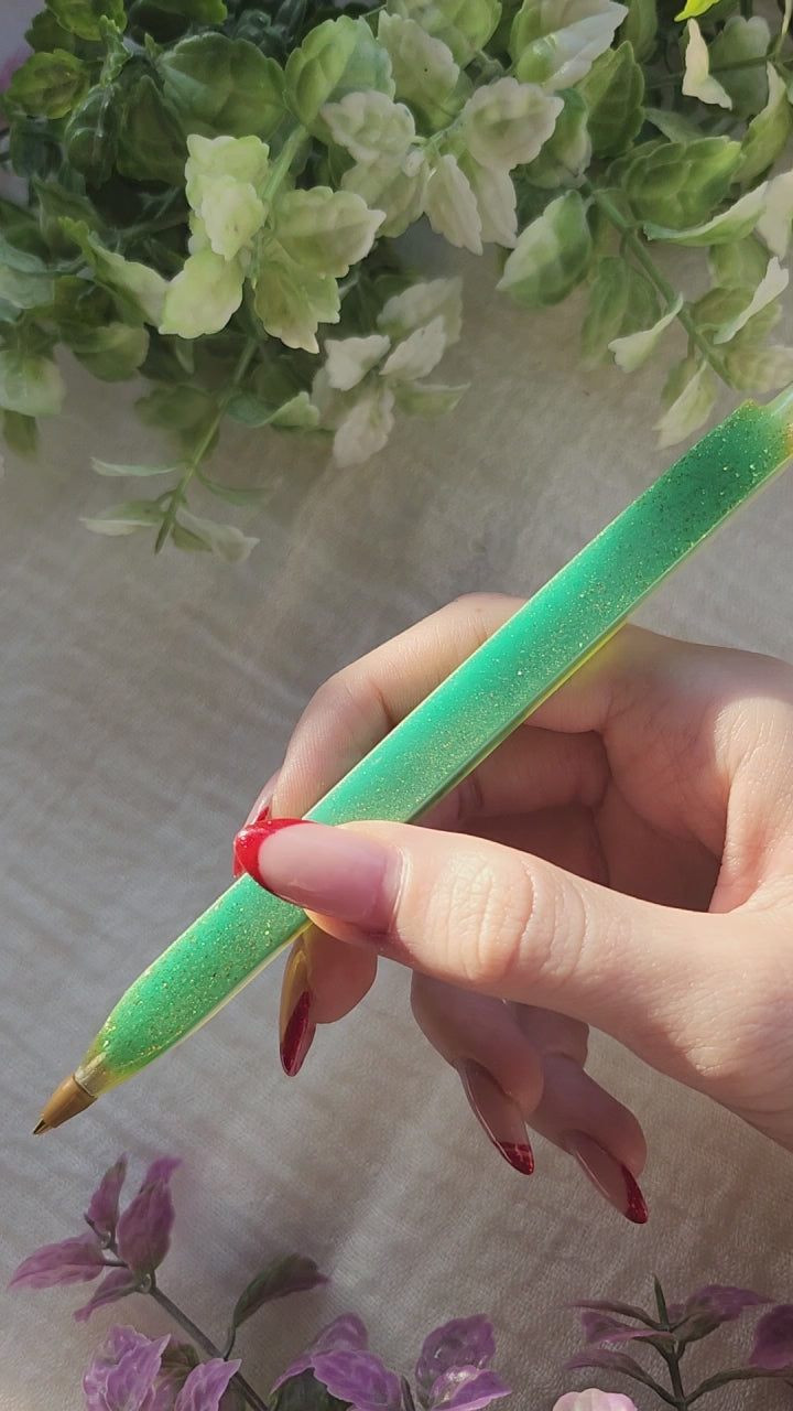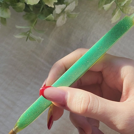 La superficie lucida della resina cattura la luce e mette in risalto i giochi cromatici interni, trasformando un gesto quotidiano come scrivere in un piccolo momento di magia e bellezza.