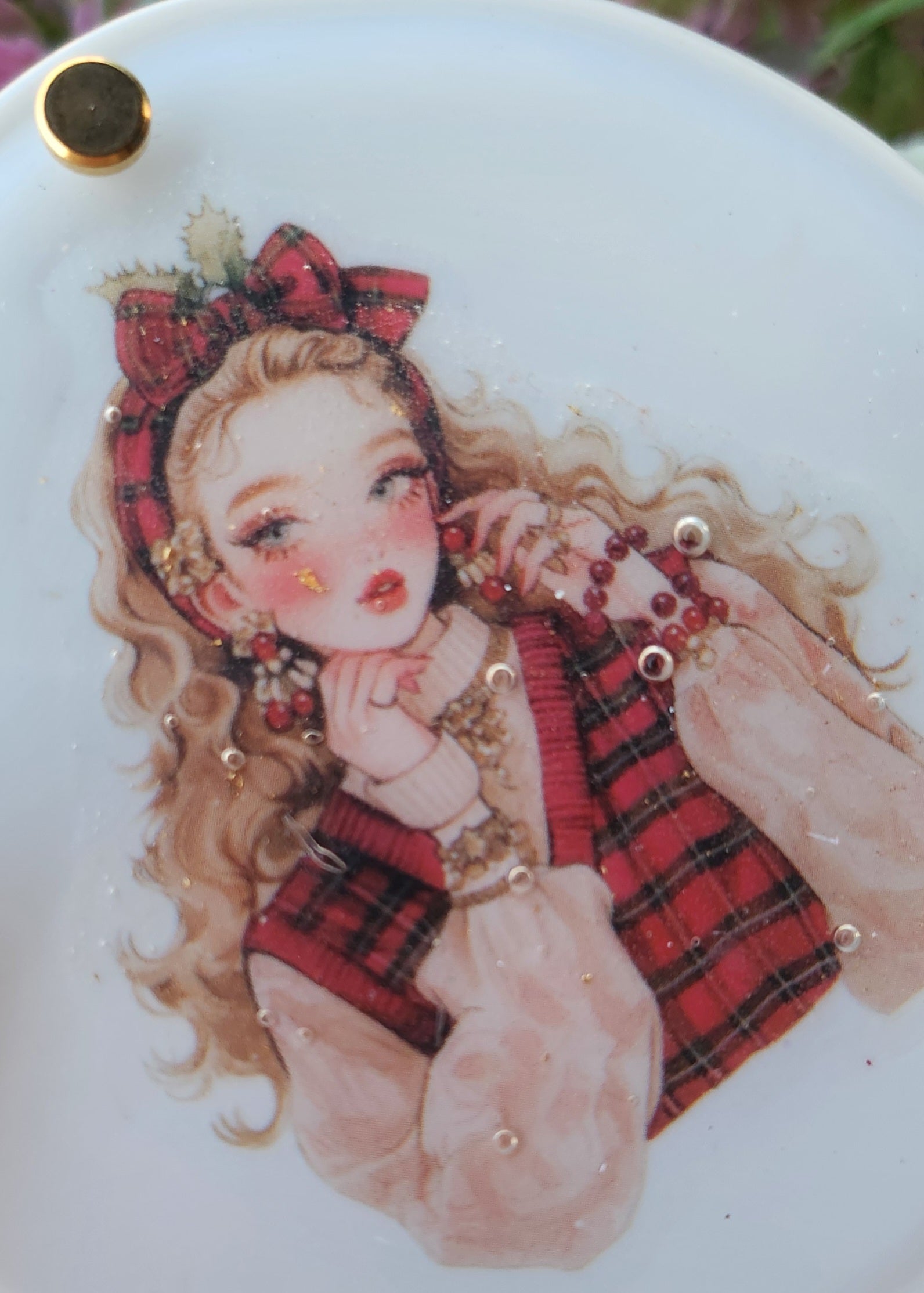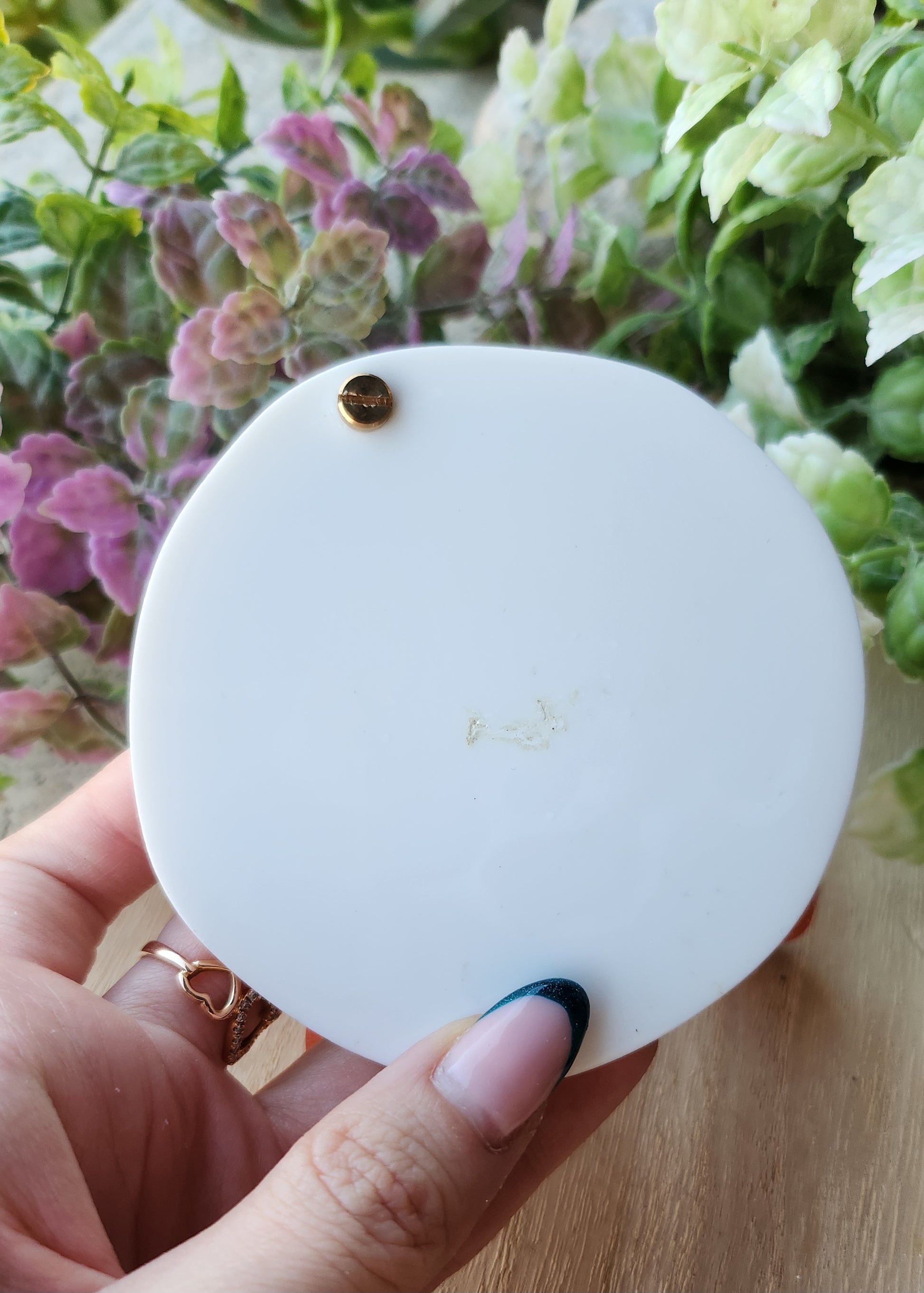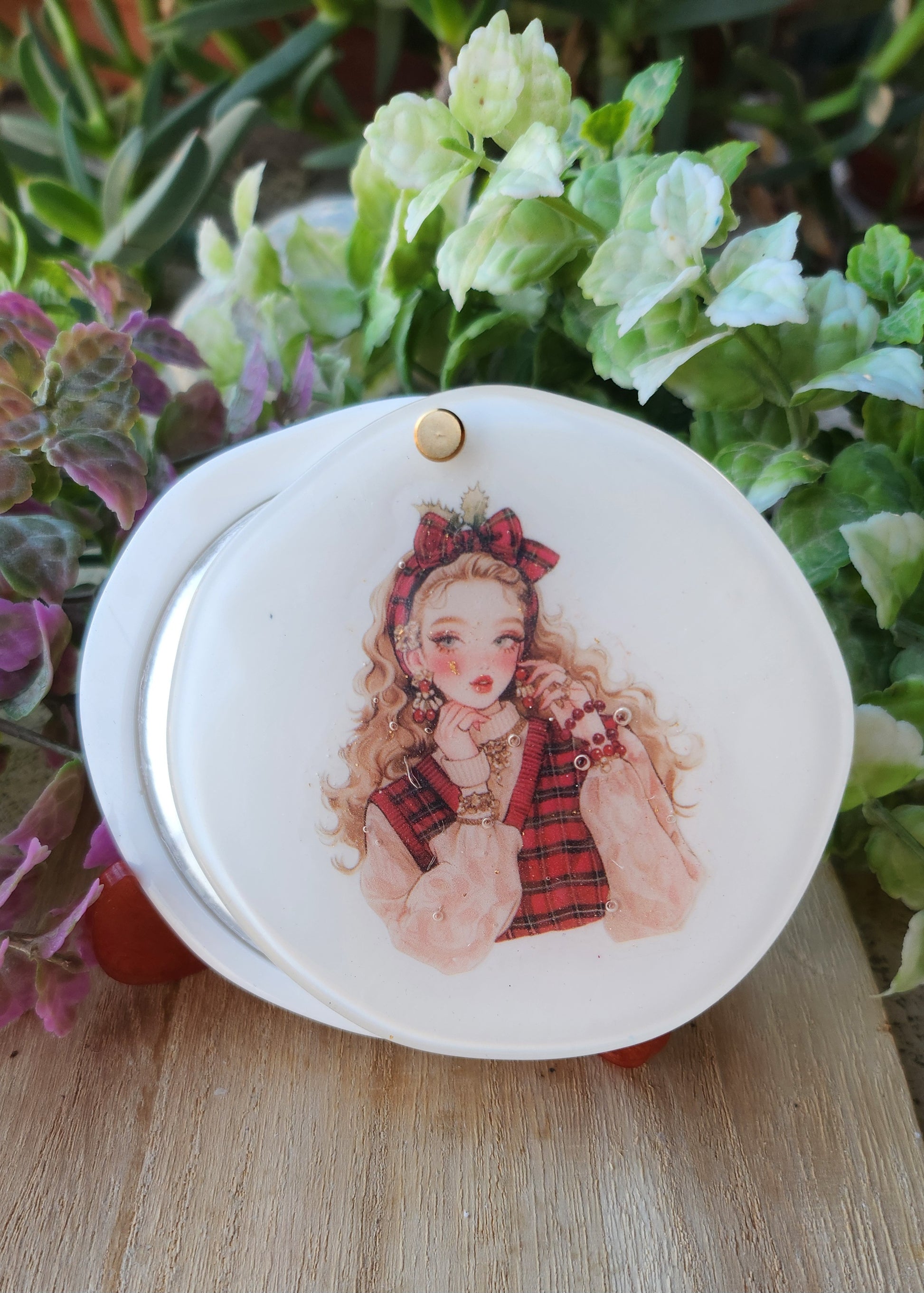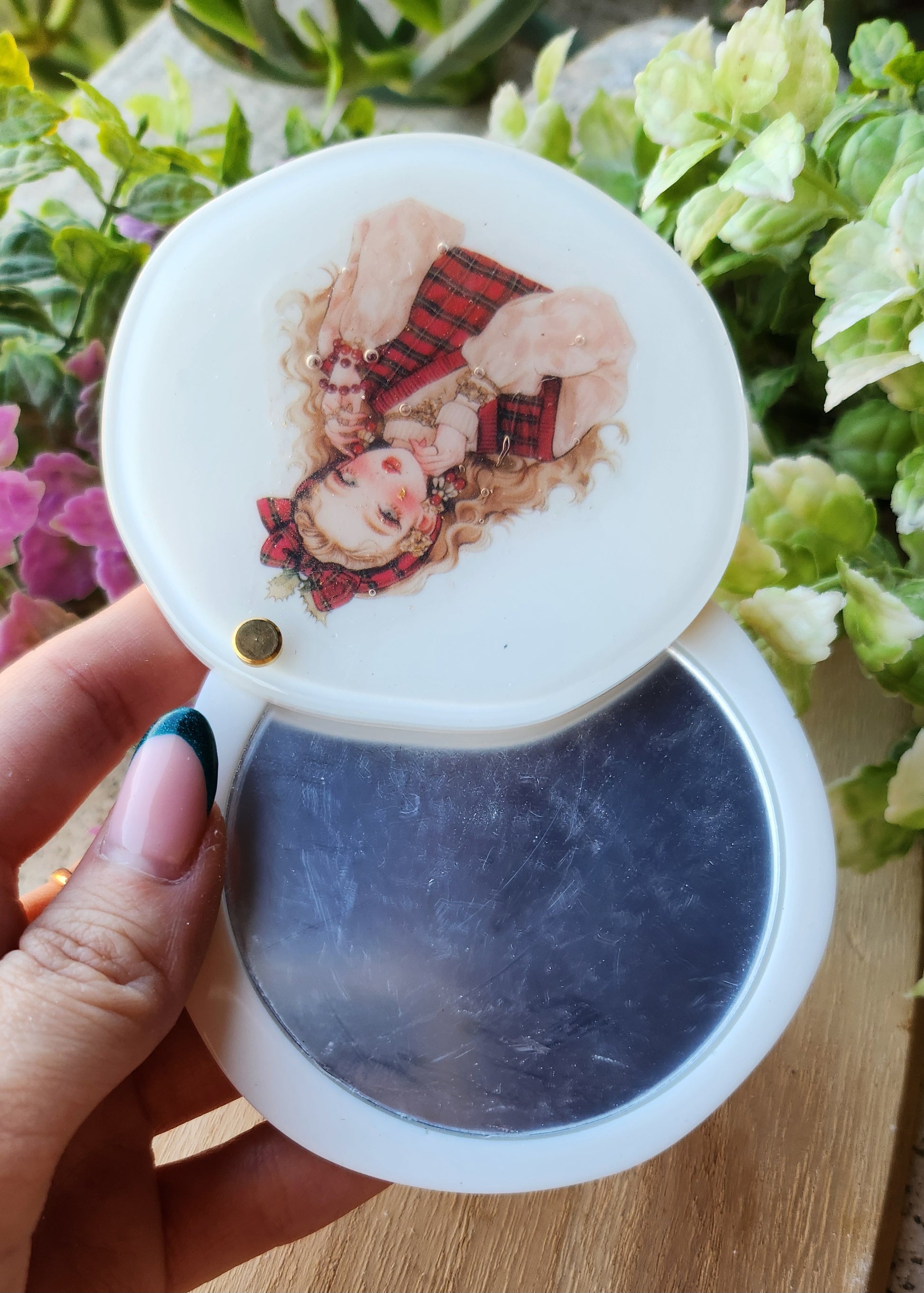 Specchietto da borsetta realizzato interamente a mano in resina epossidica con decoro illustrato in vinile inglobato nella colata. Ogni pezzo nasce da un processo artigianale che rende ogni creazione unica con leggere variazioni e imperfezioni che raccontano la lavorazione manuale.